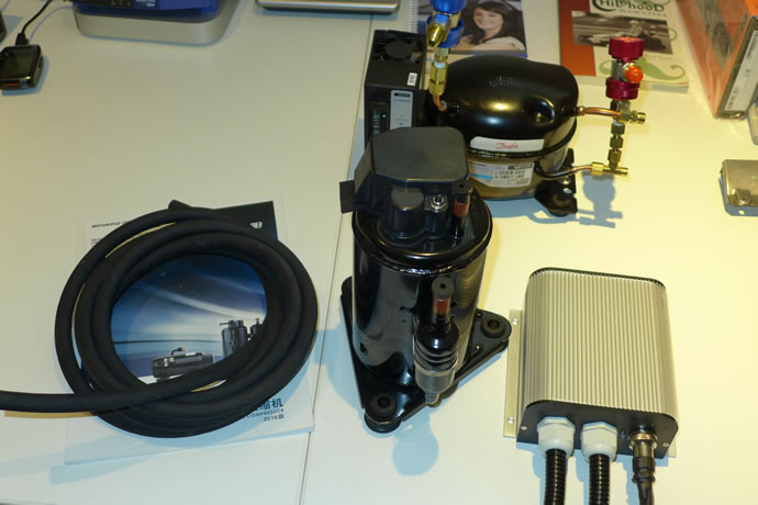 Boyard JVB075Z12 : 7.5cc cylinder volume, 2500-3700rpm, 25amps@13.5V (340W) to produce approx 850W watts of cooling (2900BTU/hr [higher COP efficiency of 2.5] of cooling at 3300rpm (so at 3700rpm it will produce closer to 3250BTU/hr at 30amps), 16lbs with controller, should result in a temperature drop of closer to 15 degrees C in comparison to the Danfoss unit at 3700rpm.