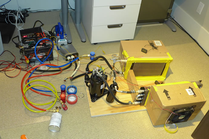 I took all of my new parts for the electrical A/C system and put them on the prototype system: new #6 A/C barrier hose and fittings for the drier/filter unit, lots of temperature sensors to bench test the system, and more air boxes to fine tune the performance and help squeeze every last drop of performance and efficiency from this system (given that it is a bit marginal re. cooling capacity). In the end the amount of R134a refrigerant charge that provided the best performance was 35psi on the low side with the compressor running at max speed (4,400rpm at 13.5amps/13.3V). This provided close to 7 degrees C of air cooling across the evaporator at an equivalent to a 'low' blower setting in the car and a little over 4 degrees C of air cooling at an equivalent of a 'medium/high' blower setting (150cfm - enough to change the air in the cabin every 30 seconds). The performance #s are solid: 160W of electrical energy providing approx 400W of cooling (1,400BTU/hr). Since I have a small racing alternator I cannot afford more than about 15amps of continuous current draw at idle, so if this proves to be too little cooling the next step up in compressors is closer to 2x in both current draw and cooling, and is also 2x more expensive ($1,200 vs $600). I'll install this system and if it is not sufficient for my summer needs and I am not at the edge of my alternator capacity I might upgrade to a larger compressor .... we'll see - February 8, 2016