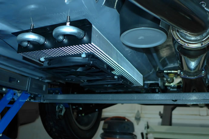 The new a/c condenser mounted under the car - better ground clearance and much higher efficiency than the prior unit